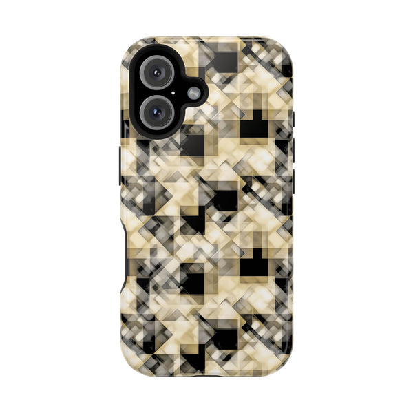 A soft golden glow filters through translucent layers, forming a geometric mosaic that feels both delicate and structured. The interplay of light and shadow adds depth, as if catching a fleeting moment of sunlight through frosted glass. The overlapping shapes create a sense of rhythm and calm, inviting the viewer to explore its serene complexity. Perfect for those who appreciate minimalistic designs with a touch of warmth and depth, this pattern offers a harmonious blend of structure and softness.