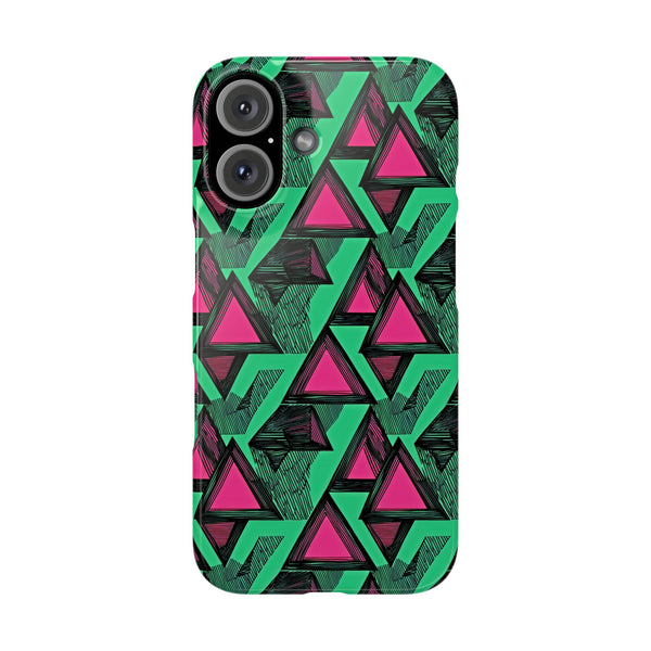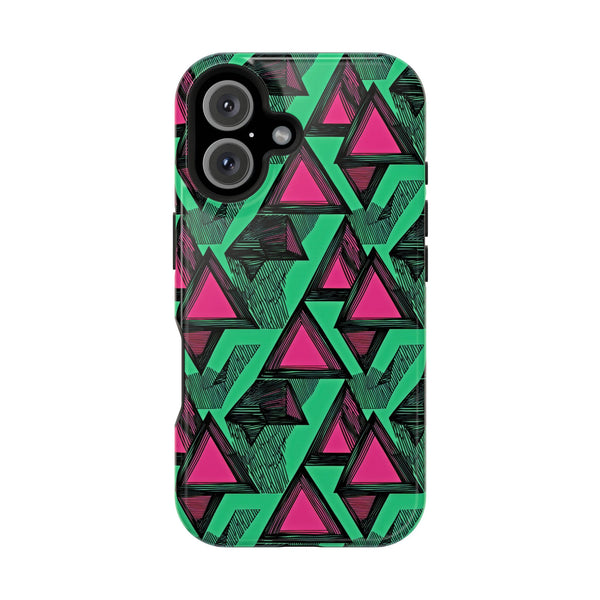 Channeling the spirit of retro pop art, this design bursts with energy and attitude. Bright pink triangles pop against the cool mint-green canvas, while bold black hand-drawn lines add depth and texture. The pattern feels like a playful homage to vintage design, with a contemporary edge that keeps it fresh and exciting. Perfect for those who love vibrant colors and daring patterns, this design makes a bold statement and adds a touch of creative flair to any style.