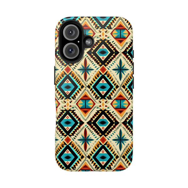 Desert Eye brings together sharp geometric lines and soft hues of teal, orange, and black, creating a mesmerizing pattern. The intricate diamond shapes and sunburst motifs evoke a sense of both protection and mystery, reminiscent of ancient desert cultures. With its bold symmetry and vibrant contrasts, this design is a modern reimagining of tribal art. Ideal for those looking to incorporate both strength and elegance into their style.