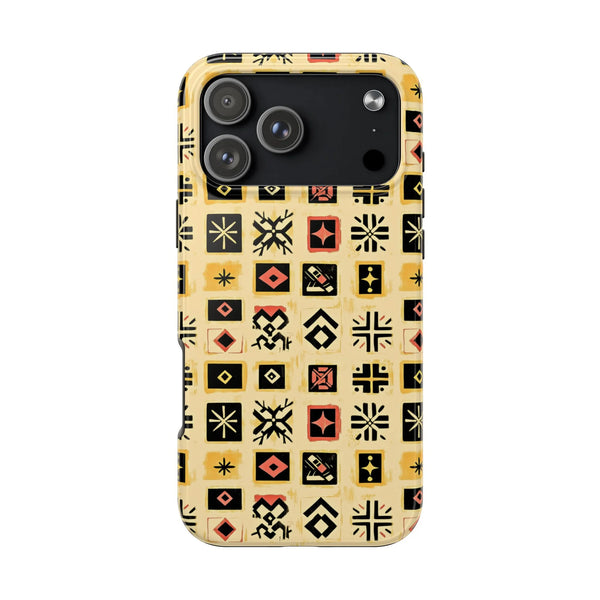 Sunstone Tiles showcases a harmonious blend of ancient motifs in a grid of bold geometric patterns. Each tile bursts with energy through symbols that evoke celestial bodies and abstract forms, using a warm palette of black, gold, and coral. The repetitive arrangement and hand-painted textures give the design a rustic yet modern appeal, making it a standout piece for those who love the intersection of tradition and contemporary style.