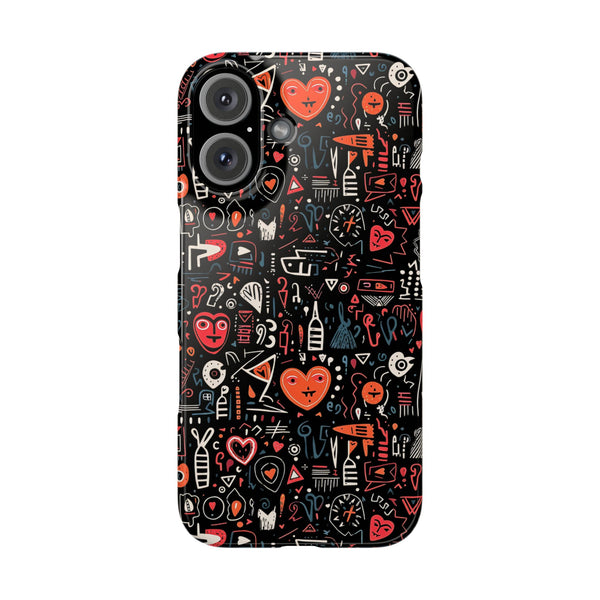 Heartbeats is a vibrant fusion of abstract shapes, faces, and symbols, brought to life with striking reds, whites, and blues against a bold black backdrop. The playful arrangement of hearts and freeform lines creates a sense of movement and spontaneity, celebrating the raw energy of artistic expression.