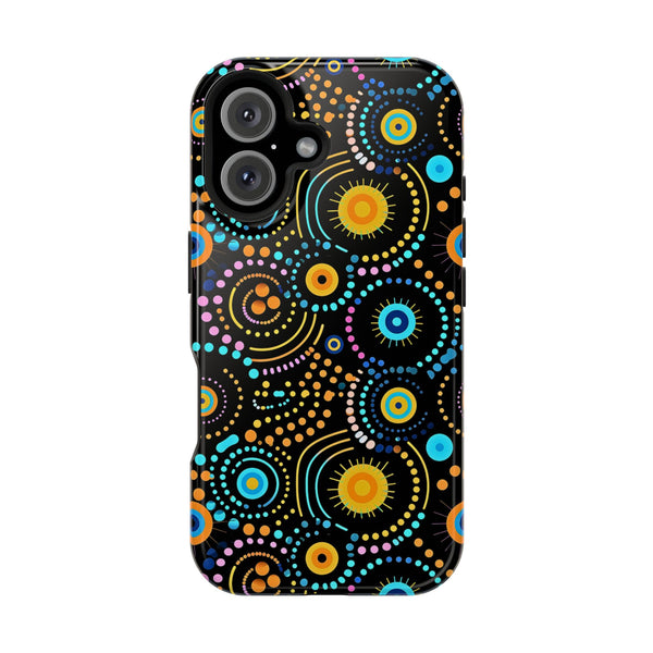 Inspired by the harmonious patterns of sound waves, Sonic Eclipse brings together vibrant colours and circular shapes in a rhythmic flow. The bright oranges, blues, and pinks contrast against a black background, creating a design that feels both cosmic and deeply connected to natural cycles. This piece offers a modern take on ancient symbolism, perfect for those who embrace bold expression with cultural depth.