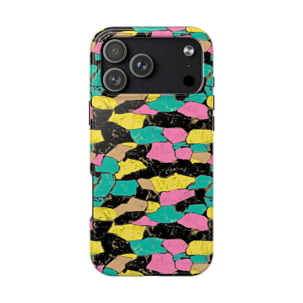 Vibrant and edgy, Mosaic Pop combines bold fragments of colour, yellow, teal, pink, and brown—on a textured dark background. The rough, stone-like shapes give the design a raw, urban feel, while the bright palette keeps it lively and dynamic. Ideal for those who love a playful yet rugged aesthetic, this design adds a splash of personality to any tech accessory. Mosaic Pop is perfect for making a bold statement, whether you’re in the city or on the go.