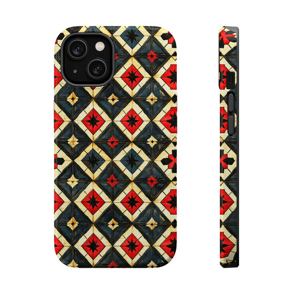 This design features a bold interplay of star-like shapes and geometric forms, evoking a sense of timeless tradition. Deep red, black, and cream hues create a rustic yet sophisticated look, while aged textures add a vintage charm. Each diamond-shaped tile showcases a unique starburst pattern, blending heritage with modern appeal, offering an eye-catching, structured design perfect for stylish statements.