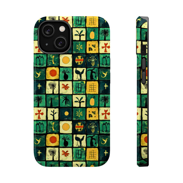 Symbolic Mosaic presents a grid of hand-drawn cultural icons, each square telling its own story. Earthy tones of green, yellow, and cream provide a natural backdrop for simple yet powerful shapes, such as trees, crosses, and abstract figures. Rough textures and worn edges lend a rustic, handcrafted feel, blending modern minimalism with ancient traditions, making it perfect for meaningful, artistic expressions.