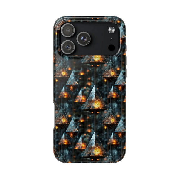 In a dimly lit space, suspended pyramids glimmer with golden light, casting delicate reflections across a shadowed canvas. Each geometric shape seems to hold a secret, glowing like embers in the night. The textured surfaces and warm illumination create a mesmerizing interplay of contrast and radiance, evoking both intrigue and serenity. Perfect for those who appreciate intricate designs and atmospheric elegance, this pattern radiates timeless sophistication.