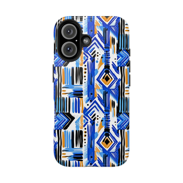 Painted Echoes brings ancient patterns to life with bold brushstrokes and vibrant colors. The dynamic mix of geometric shapes in striking blues, blacks, and tans reflects a modern interpretation of traditional Aztec motifs. Perfect for adding a touch of history with a contemporary twist to any style.