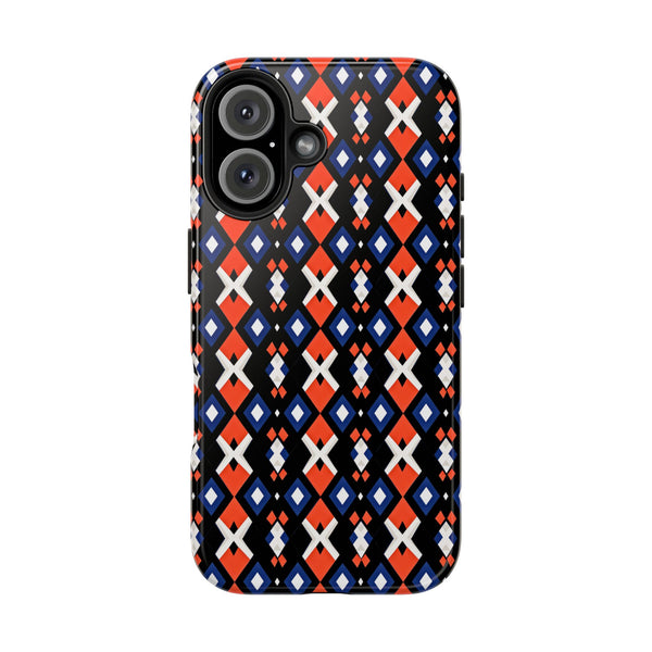 In a world of geometric brilliance, ‘Ruby Diamonds’ shines like a masterpiece crafted from bold contrasts. Picture a tapestry woven with the rich hues of ruby red and midnight blue, intersected by sharp white accents. Each diamond shape reflects the precision of a jeweler’s touch, forming a pattern that feels both powerful and timeless. For those who carry an aura of confidence and elegance, ‘Ruby Diamonds’ serves as a reflection of your bold, unmistakable style. It’s more than a design. It’s your signature of sophistication.