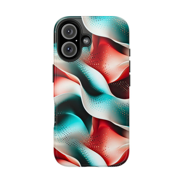 Smooth, surreal, and charged with style — Velvet Voltage wraps digital intensity in a silky-soft illusion. Coral reds melt into arctic teal and creamy whites, folding like liquid fabric caught mid-motion. Perforated dots ripple across the curves like light particles on skin, dancing with each shift and shadow. This design whispers glamour but roars with edge. Think cyberpunk elegance, filtered through a dream. It's made for those who blur boundaries, love drama, and carry a spark beneath the surface. Soft to the eye. Bold to the core.