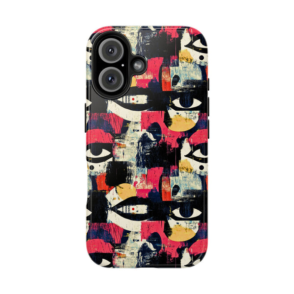 Bold eyes peer through abstract layers of textured color, blending deep blues, bright pinks, and warm yellow accents. The raw, distressed style of this design creates a sense of depth and mystery, evoking an ancient connection while embracing a modern, expressive approach. Perfect for those who appreciate art that both watches and inspires.
